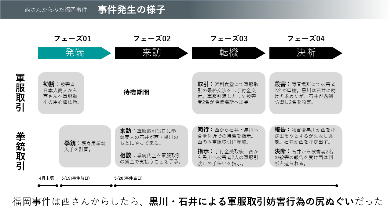 ①事件から1カ月前の4月末頃、福岡にて西さんは被害者となった日本人商人熊本さんから軍服ヤミ取引の用心棒を頼まれていました。熊本さんが軍服取引の段取りを進めている間、待たされていた西さんは西さんが終戦直後に経営していた劇癌芸能社の元部下・黒川(仮名)さんへ護身用拳銃を贈るために拳銃売買をおこなっていました。