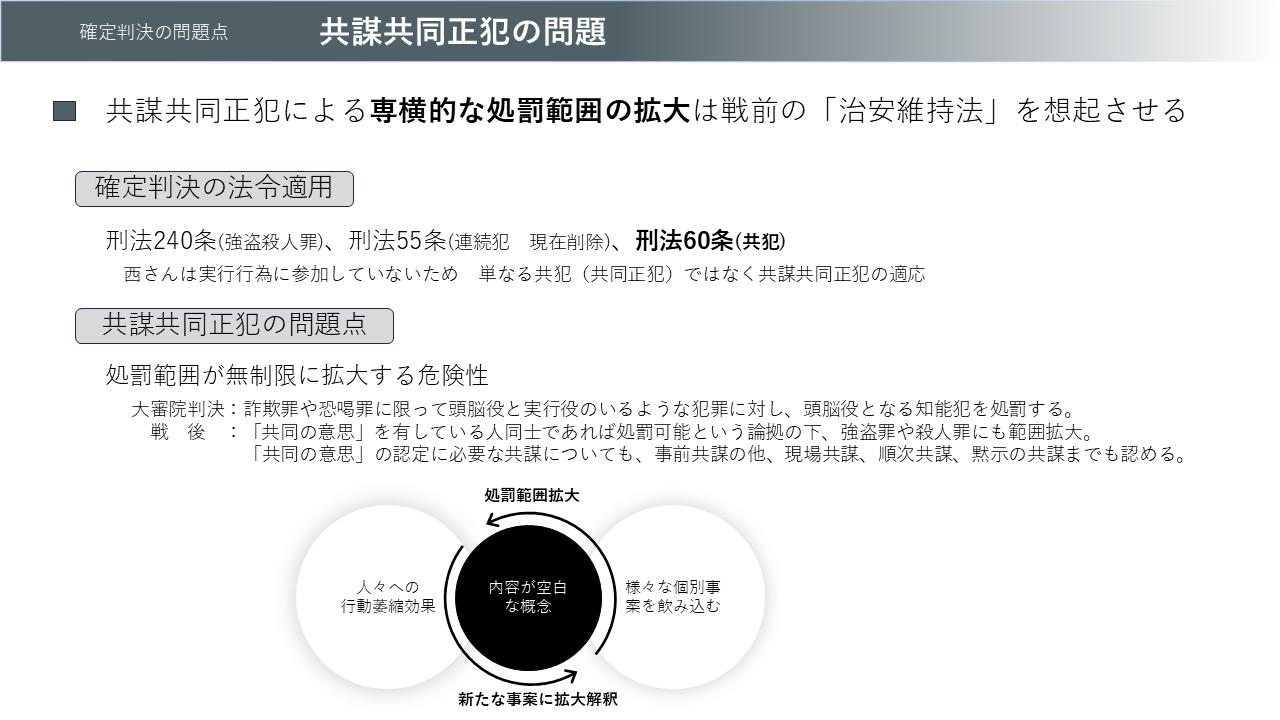 適用法令として判決に挙げられているのが3点、まず刑法240条、強盗殺人罪。これは熊本さんと翁さんの殺害によって現金を持ち去った行為が該当するとされています。2点目が刑法55条の連続犯の規定。こちらは現在の刑法では削除済の項目ですが、刑罰の併合に関する規定です。3つ目の刑法60条は複数の人が共同して犯罪を実行したという共犯の規定になります。確定判決において西さんは共謀のみで殺害の実行行為に参加してないことになっていますから、単なる共犯(共同正犯)ではなく、共謀共同正犯の適応となります。