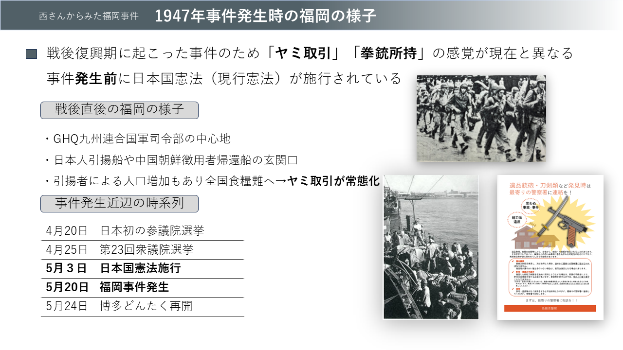 それでは福岡事件の問題とは一体何なのか?そのことをお話しする前に、もう一度事件概要を振り返ってみましょう。先に宮本先生から事件概要の話がありましたから、私からは西さんからみた福岡事件を西さんの証言をもとに再現したいと思います。戦後直後の1947年、福岡はGHQ九州連合国軍司令部の中心地であり、また大陸から戻ってきた日本人の引揚船の玄関口であると同時に、中国・朝鮮からの徴用者が大陸に戻る玄関口でもありました。1947年4月末頃には日本初の参議院選挙と第23回衆議院選挙のダブル選挙、そして同5月3日には現在の日本国憲法施行と、福岡だけでなく日本全国、終戦から2年の時を経て復興しつつありました。