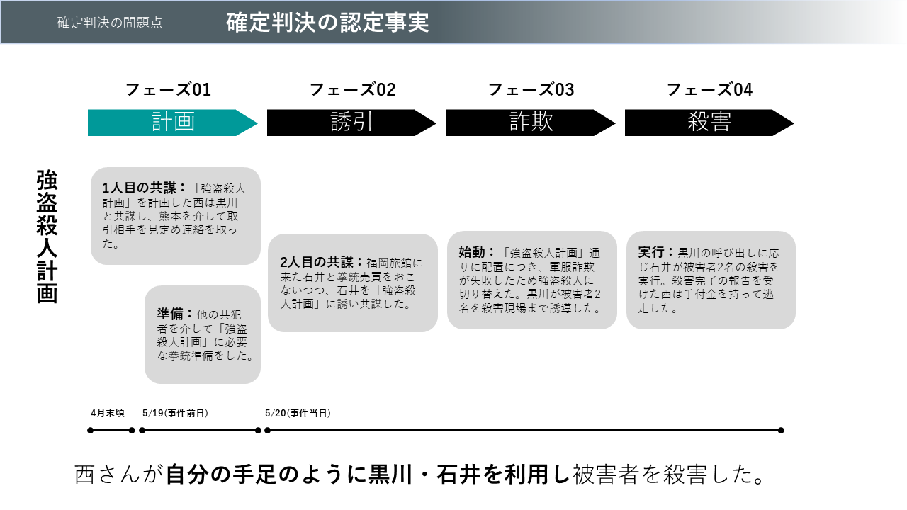 確定判決は時系列から、大きく4点に分かれます。①4月末から西さんと黒川さんが「強盗殺人計画」を共謀し、その事前準備として日本人商人熊本さんを介して軍服の買い手を探し、他方拳銃入手の斡旋を共犯者に依頼した。②事件当日、福岡旅館に来た拳銃売人の石井さんと拳銃売買をおこないつつ、石井さんを「強盗殺人計画」に誘い共謀した。③西さんは軍服ヤミ取引に参加し、他の華僑商人達と食堂に残るなか、黒川さんと石井さんは「強盗殺人計画」どおりに日本人商人と華僑重鎮を外に連れ出して殺害した。④被害者殺害後、黒川さんや石井さんが食堂に戻り、軍服積込完了の嘘報告をした。これを受けて、西さんが華僑商人達に残金を請求するも断られ逃走した。